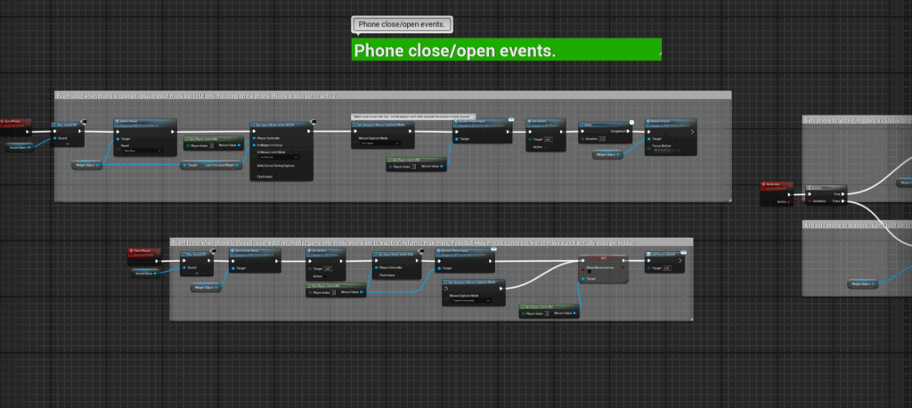 The phone is primarily programmed in Unreal Engine 5 using Blueprints, with some additional C++ to control systems I couldn’t otherwise. There are a lot of them, but here are a few snippets showing off some different parts: